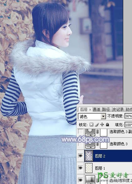 12、按Ctrl + Alt + 2 调出高光选区,按Ctrl + Shift + I 反选。然后创建纯色调整图层,颜色设置为暗蓝色:#411D7B,混合模式改为“滤色”,不透明度改为:30%,效果如下图。这一步给图片暗部增加蓝色。