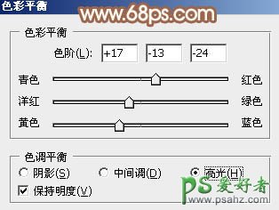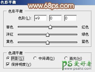 4、创建色彩平衡调整图层,对阴影,高光进行调整,参数设置如图8,9,效果如图10。确定后按Ctrl + Alt + G 创建剪贴蒙版,效果如图10。这一步调整云彩高光及暗部颜色。