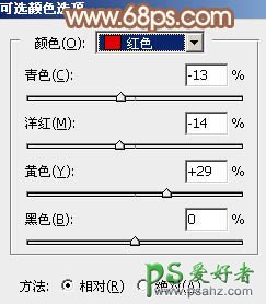 5、创建可选颜色调整图层,对红、黄、白、中性、黑进行调整,参数设置如图11 - 15,效果如图16。这一步给图片增加橙红色。