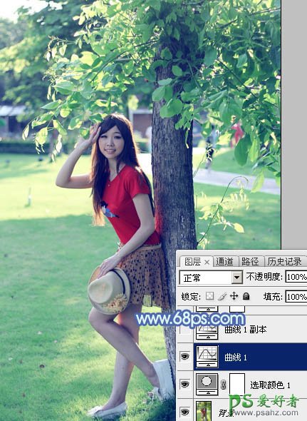 PS调色教程:给公园里的良家熟女自拍照调出流行的淡调青蓝色