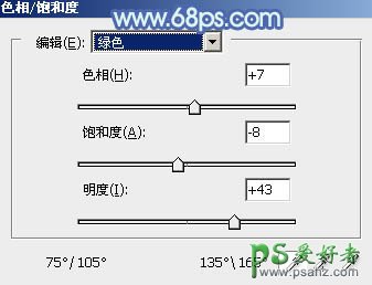 4、创建色相/饱和度调整图层,对绿色进行调整,参数及效果如下图。这一步主要把图片中的黄绿色调淡一点。