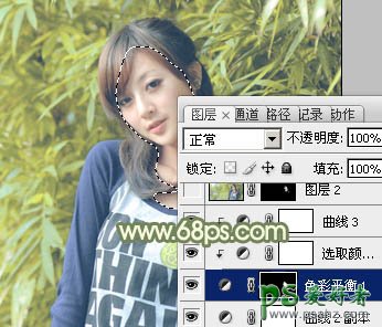 7、用套索工具把人物脸部选取出来,羽化2个像素后分别用曲线及色彩平衡调整一下肤色,并调亮一点,如下图。