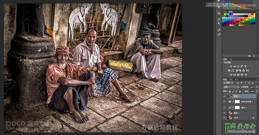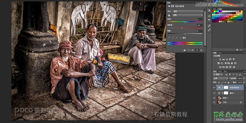 新建色相饱和度,降低全图饱和度,但保留黄色(用蒙版把黄色擦出来),黄色在整个画面起到平衡的作用,也通过保留黄色的饱和度提升画面的对比