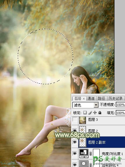 ps调色教程:给清纯的湖景美女图片调出温馨的青黄色效果