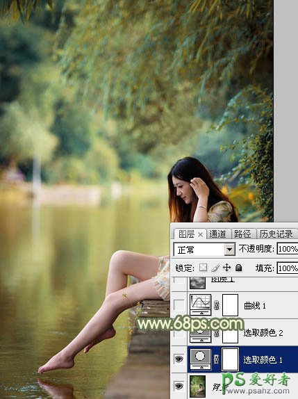 ps调色教程:给清纯的湖景美女图片调出温馨的青黄色效果