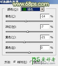 2、创建可选颜色调整图层,对红、黄、绿进行调整,参数设置如图4 - 6,效果如图7。这一步同样给图片增加橙黄色。