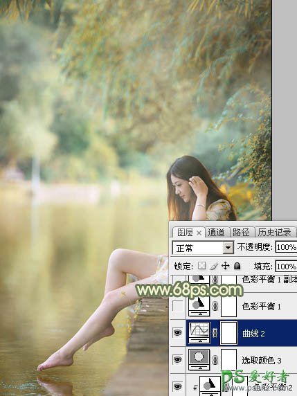 ps调色教程:给清纯的湖景美女图片调出温馨的青黄色效果