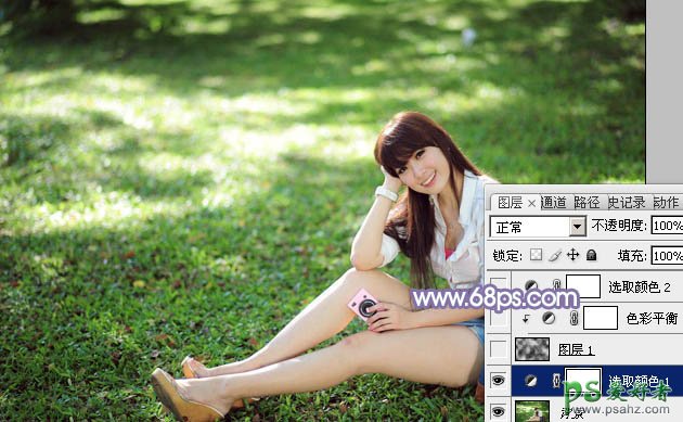 PS给绿茵地上自拍的年轻少妇性感图片调出梦幻的青蓝色调