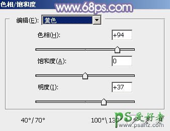 6、创建色相/饱和度调整图层,对黄色进行调整,参数及效果如下图。这一步把图片中的黄绿色转为青色。