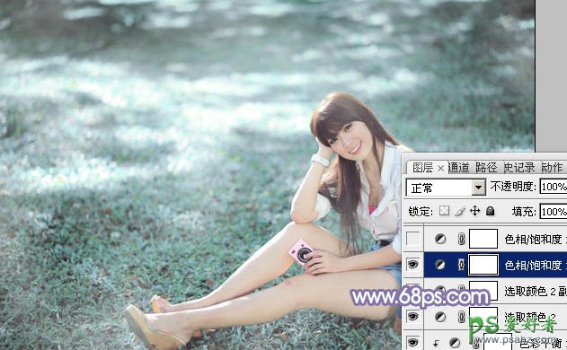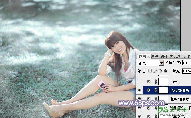 PS美少妇图片调色教程,PS给绿茵地上自拍的年轻少妇性感图片调出梦幻的青蓝色调,青色效果的美女图让人感觉有一种冰美人的感觉,冷艳少妇的效果,我们的素材图片是以绿色调为主,调色师先把图片主色调统一,然后用色相/饱和度快速调成青色,后期加强暗部