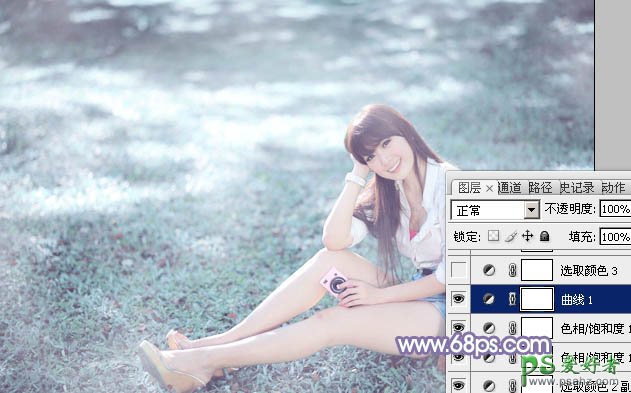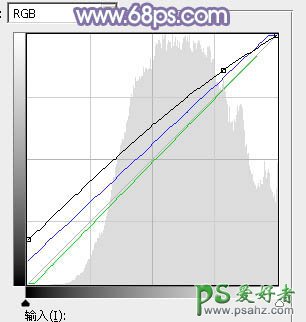 8、创建曲线调整图层,对RGB、绿、蓝通道进行调整,参数及效果如下图。这一步把图片暗部提亮,并给暗部增加蓝色。
