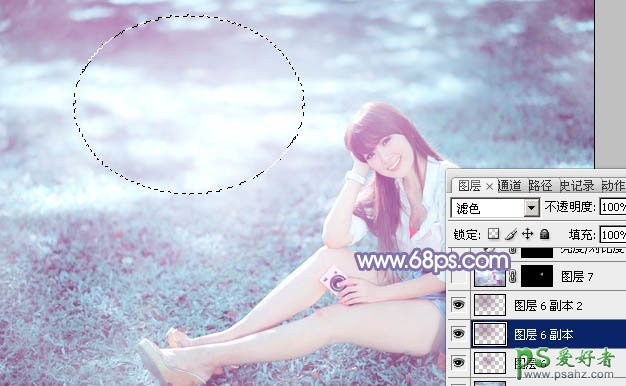 14、新建一个图层,用椭圆选框工具拉出下图所示的椭圆选区,羽化80个像素后填充暗紫色:#8E4C80,混合模式改为“滤色”,效果如下图。