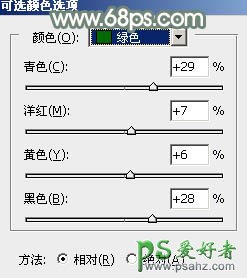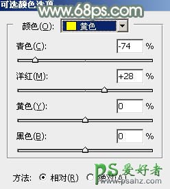 1、打开素材图片,创建可选颜色调整图层,对黄,绿色进行调整,参数及效果如下图。这一步把图片中的黄绿色转为橙黄色。