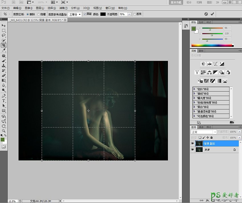 打开图像,进入到PS编辑,二次构图,做减法去除掉画面里周边杂乱的因素,这张图在拍摄的时候由于对着电视机,把相机也一并拍到了里面,二次构图的目的也主要是要切除掉照相机。