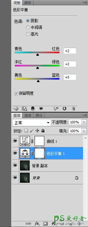 用图章工具再对画面里的杂色进行遮盖,然后使用色彩平衡和曲线工具进行简单微调。