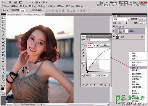 3、新建“组1”图层组,用来管理调色图层。创建一个“曲线”调整图层,然后将RGB曲线向上调节,提高画面的整体亮度。