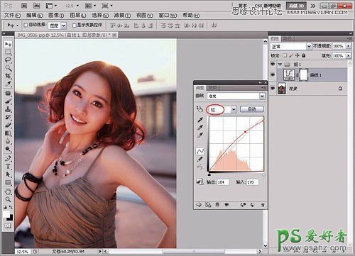 选择“红”通道,然后将曲线稍稍向上调节,为画面添加一些红色。