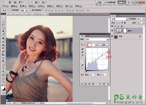 选择“蓝”通道,然后将高光控制点向下拖曳到209,接着将中上部的控制点稍稍向上调节。