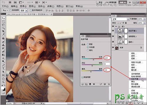5、创建一个“色彩平衡”调整图层,然后设置“青色-红色”为13,“黄色-蓝色”为-12,为画面加入暖色。