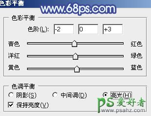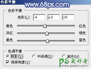 13、创建色彩平衡调整图层,对阴影,高光进行调整,参数及效果如下图。这一步主要给图片高光部分增加蓝色。