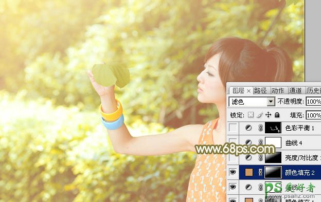 7、创建纯色调整图层,颜色设置为黄褐色:#CE9A68,选择渐变工具,颜色设置为黑白,在蒙版上由左上角只右下角拉出白黑渐变,确定后把混合模式改为“滤色”,效果如下图。