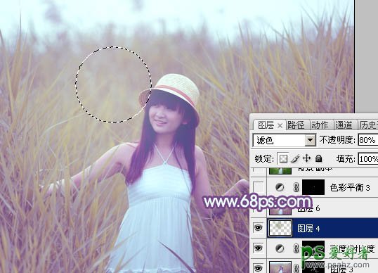 10、新建一个图层,用椭圆选框工具拉一个椭圆选区,羽化50个像素后填充暗绿色:#7B904D,混合模式改为“滤色”,不透明度改为:80%,效果如下图。