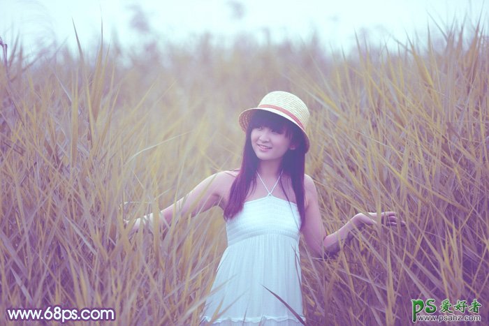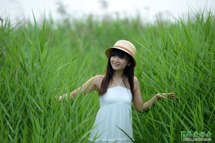 PS美女图片调色教程,女孩儿生活照后期美化调色,夏季照片转为秋景照色彩,今天我们的PS教程自学网平面设计师利用photoshop软件给绿色芦苇地里的可爱女孩儿调出秋景效果,制作过程并不复杂,非常适合我们的入门者学习,主色基本上都是绿色,过于单调。可以考虑把主色转为冷色,即绿色转为较为柔和的黄褐色,暗部增加一点蓝色即可。