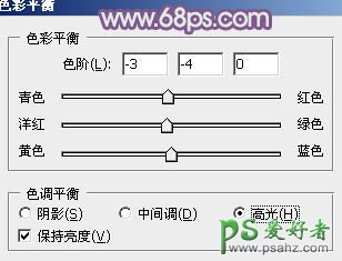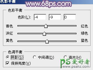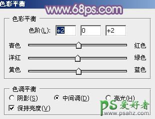 7、创建色彩平衡调整图层,对阴影、中间调、高光进行调整,参数设置如图20 - 22,效果如图23。这一步主要给图片暗部增加紫色。