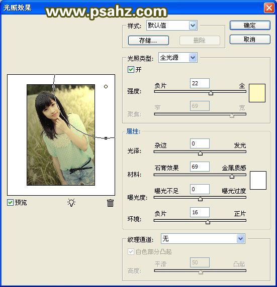 3、盖印图层(ctrl+shift+alt+e),执行滤镜/渲染/光照效果,具体设置如图: