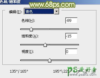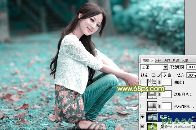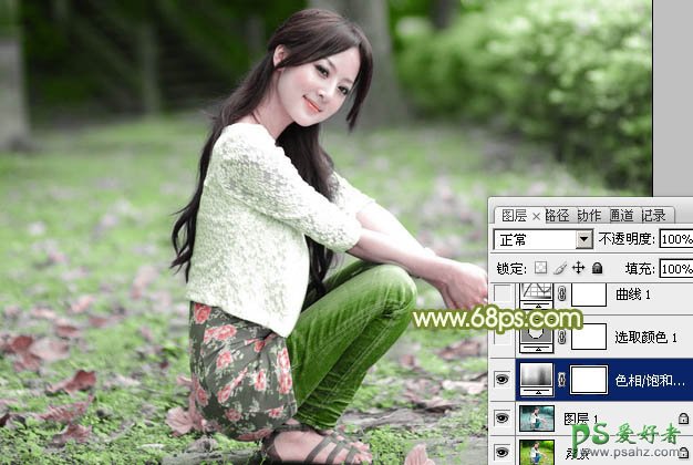 2、创建色相/饱和度调整图层,对青色进行调整,参数及效果如下图。这一步把图片中的青色转为黄绿色。
