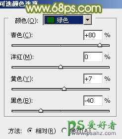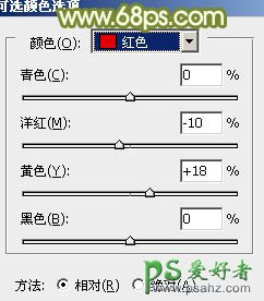 3、创建可选颜色调整图层,对红,绿进行调整,参数设置如图4,5,效果如图6。这一步把绿色部分稍微调淡一点。