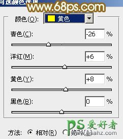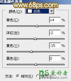 5、创建可选颜色调整图层,对黄,白进行调整,参数设置如图16,17,效果如图18。这一步给图片增加橙黄色。