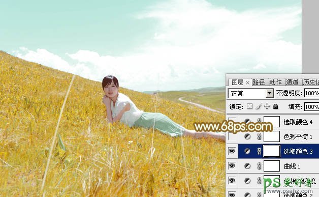 PS暖黄色小清新美女调色:给草坡上自拍的少女调出唯美暖黄色