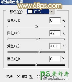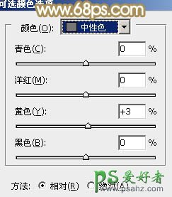 2、创建可选颜色调整图层,对黄、白、中性色进行调整,参数设置如图4 - 6,确定后把图层不透明度改为:30%,效果如图7。这一步微调图片中的暖色。
