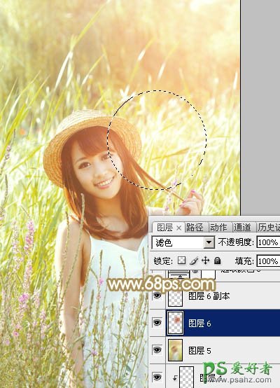 11、新建一个图层,用椭圆选框工具拉出下图所示的椭圆选区,羽化60个像素后填充暗红色:#BC5521,确定后把图层混合模式改为“滤色”,效果如下图。这一步给图片局部增加高光。