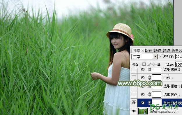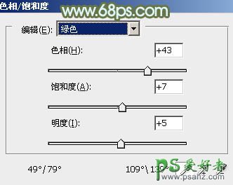 1、打开素材图片,创建色相/饱和度调整图层,对绿色进行调整,参数设置如图1,确定后把图层不透明度改为:20%,效果如图2。这一步给图片增加青色。