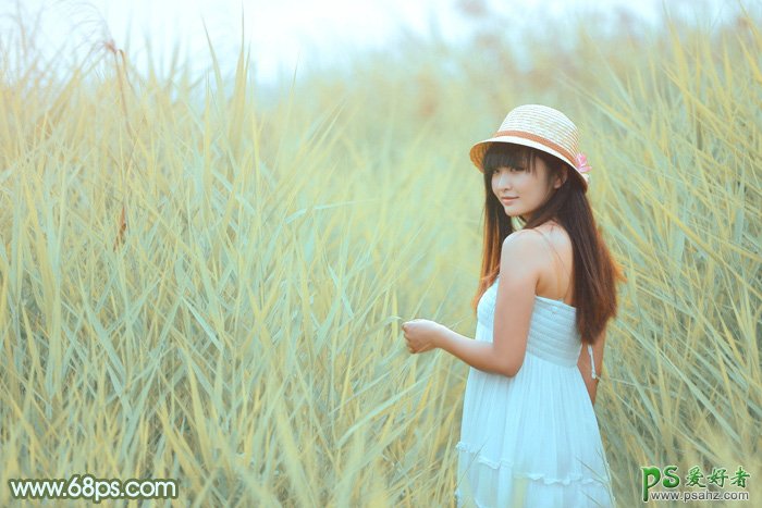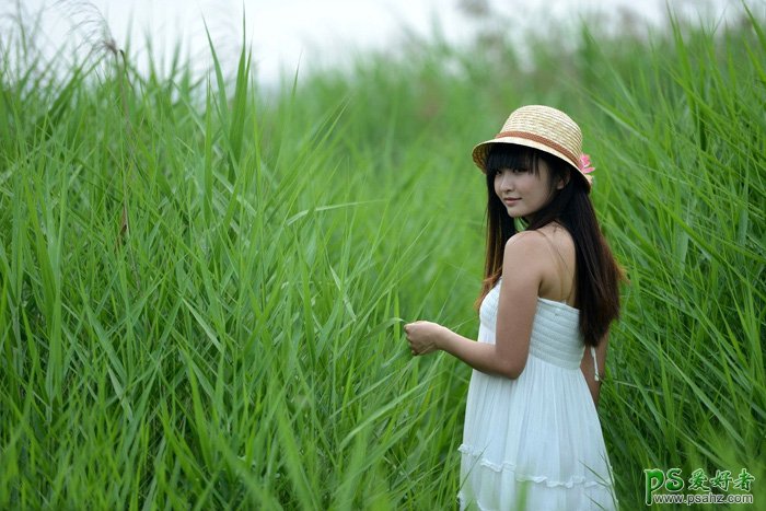 PS美女图片调色教程,PS教程自学网调色修图师教大家学会用photoshop软件给芦苇地里青春少女摄影写真照调出青黄色效果,很唯美,很漂亮,让漂亮的女孩儿显得更性感,清纯,素材图片基本上都是绿色,有点单调。调色的时候需要给图片增加颜色,最快的方法就是直接在暗部及高光部分增加,然后把主色转为喜欢的颜色即可。