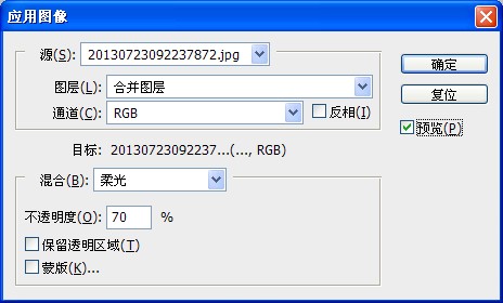3、盖印图层(ctrl+shift+alt+E),执行图像/应用图像命令,具体设置如图:
