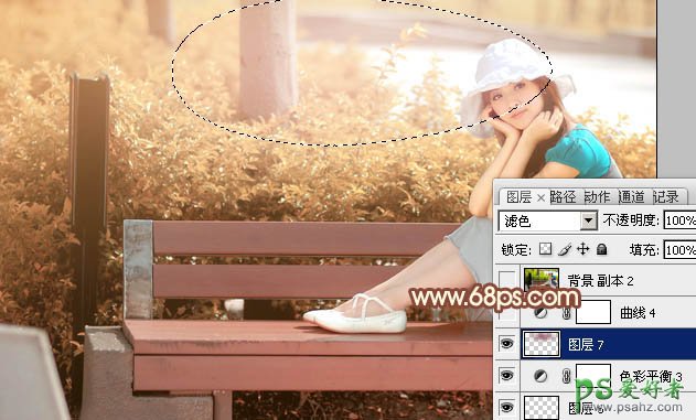 12、新建一个图层,用椭圆选框工具拉出下图所示的选区,羽化100个像素后填充红褐色:#9D5F6D,混合模式改为“滤色”,效果如下图。这一步给图片局部增加高光。