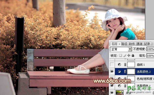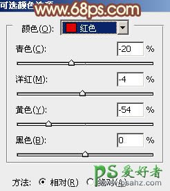 3、创建可选颜色调整图层,对红,黄进行调整,参数设置如图6,7,效果如图8。这一步把图片中的橙黄色调淡。