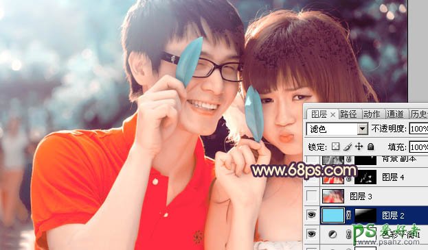 10、新建一个图层,填充淡青色:#78DBF6,混合模式改为“滤色”,添加图层蒙版,选择渐变工具,颜色设置为黑白,然后由左上角至右下角拉出白色至黑色线性渐变,效果如下图。