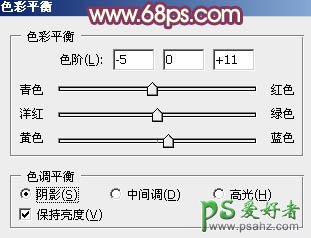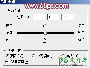 10、按Ctrl + Alt + 2 调出高光选区,按Ctrl + Shift + I 反选,然后创建色彩平衡调整图层,对阴影进行调整,参数及效果如下图。这一步微调图片暗部颜色。