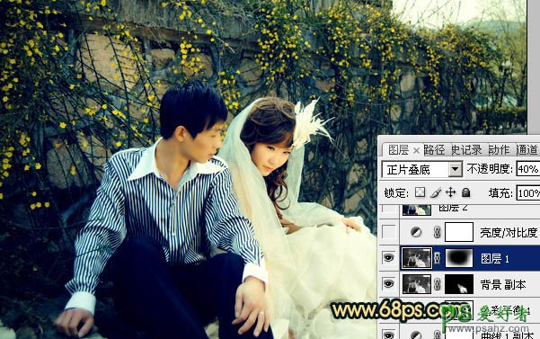 5、把背景图层复制一层,按Ctrl + Shift + ] 置顶,按Ctrl + Shift + U 去色,混合模式改为“正片叠底”,不透明度改为:40%,加上图层蒙版,用黑色画笔把中间部分擦出来,给画面增加暗角,效果如下图。
