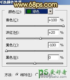 2、创建可选颜色调整图层,对黄、绿、青进行调整,参数设置如图2 - 4,确定后用黑色画笔把人物部分擦出来,效果如图5。这一步把背景黄绿转为青色。