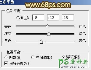 4、创建色彩平衡调整图层,对高光进行调整,参数设置如图7,确定后把蒙版填充黑色,用白色画笔把人物部分擦出来,效果如图8。