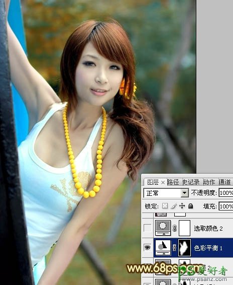 photoshop调出甜美的青黄色性感MM公园生活写真图片