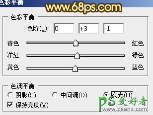 8、创建色彩平衡调整图层,对高光进行调整,参数设置如图14,效果如图15。这一步微调高光部分的颜色。