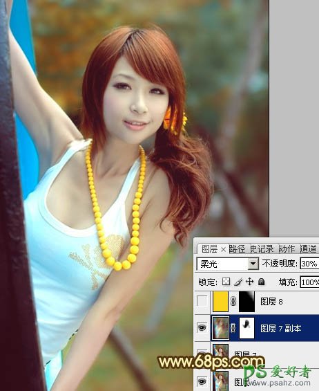 10、新建一个图层,盖印图层。执行:滤镜 > 模糊 > 动感模糊,角度为45度,距离为150,确定后把图层混合模式改为“柔光”,不透明度改为:30%,加上图层蒙版,用黑色画笔把人物脸部擦出来,效果如下图。