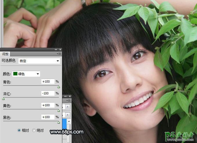 2、创建可选颜色调整图层,选择绿色,这一步是调照片中的绿色色彩亮度及饱合度,参数如图,效果如图。