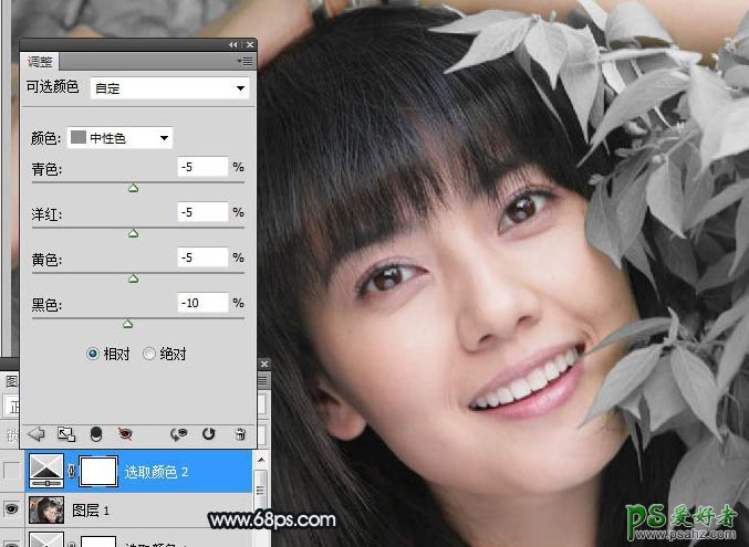 4、再次创建可选颜色调整图层,分别选择中性色及黑色,参数如图,效果如图。